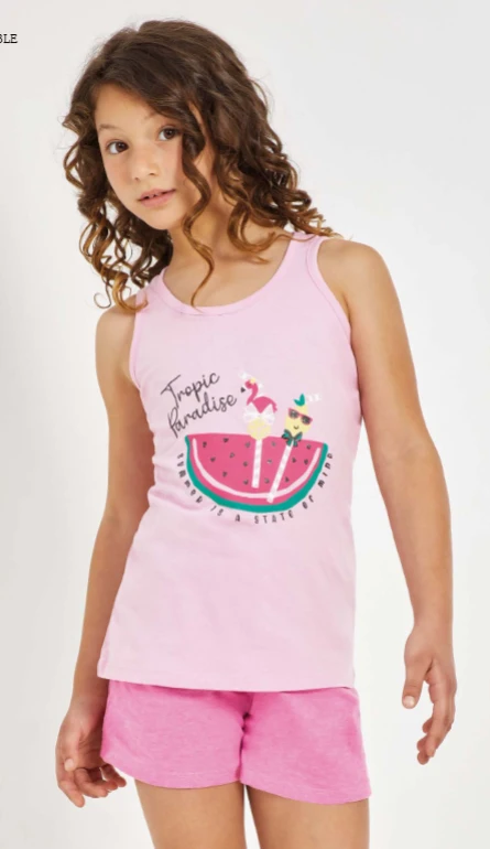 Completo Bambina canottiera corto IL GRANCHETTO 7053 Prezzo Promozionale con canottiera spalla larga stampata e pantalone corto in 100% cotone jersey leggero e fresco cotone anallergico