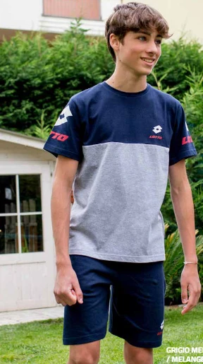 Completo Ragazzo corto Lotto sport 4128 Outlet completo junior in 100% cotone leggero jersey maglia mezza manica girocollo con stampa sul davanti e pantalone corto con laccio in vita e tasche