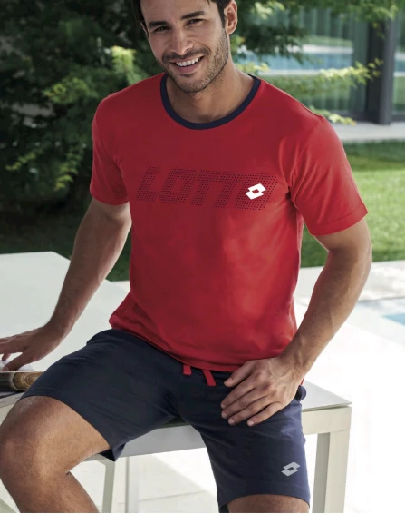Offerta Outlet Tuta Uomo corta 100%cotone jersey leggero estivo naturale ed anallergico con maglietta T-Shirt girocollo con scritta e logo Lotto sul davanti e pantalone corto con logo con comodo laccetto stringi vita e tasche sul davanti