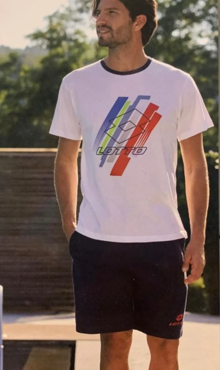 Offerta Outlet Tuta Uomo corta 100%cotone jersey leggero estivo naturale ed anallergico con maglietta T-Shirt girocollo con scritta e logo Lotto sul davanti e pantalone corto con logo con comodo laccetto stringi vita e tasche sul davanti