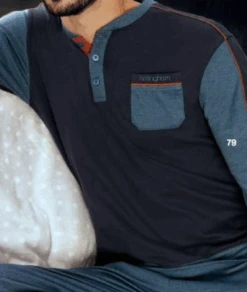Pigiama Uomo caldo cotone Nottingham 32342 Prezzo Promozionale Outlet Bellissimo Pigiama uomo in cotone pesante caldo interlock ideale come tuta casa maglia serafino bicolore con comodo taschino e pantalone tinta unita con bordo confort alla caviglia.