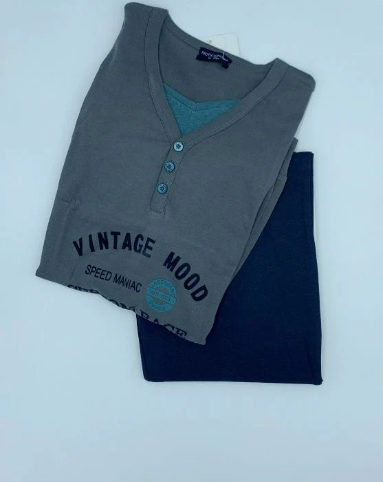 Bellissimo Pigiama uomo in cotone pesante caldo interlock ideale come tuta casa maglia girocollo e serafino bicolore con stampa sul davati e pantalone tinta unita con bordo confort alla cavigliae laccio in vita.