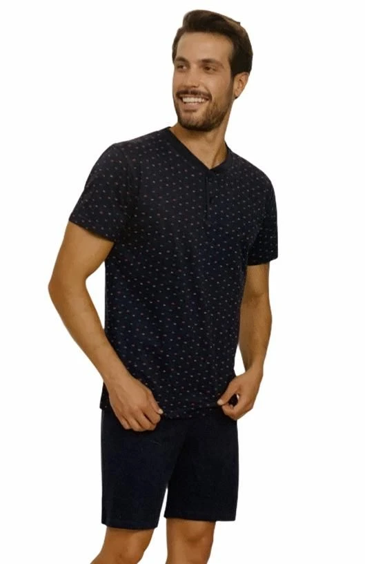 Offerta outlet Pigiama Uomo corto 100% cotone leggero estivo jersey naturale ed anallergico con maglia mezza manica fantasia cravatta piccola, aperta a serafino due bottone e pantalone corto tinta unita.