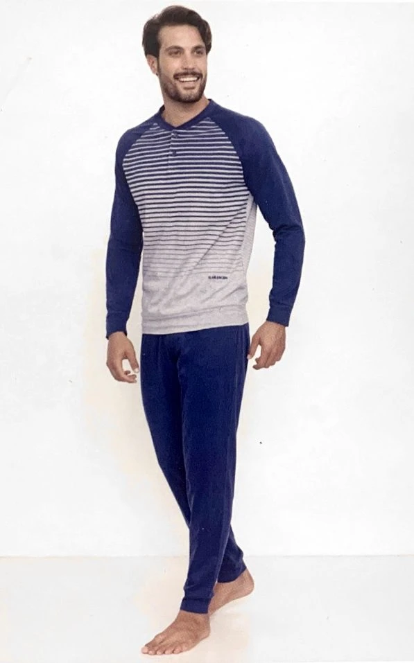 Offerta outlet Pigiama Uomo lungo 100% cotone leggero estivo in jersey naturale ed anallergico con maglia manica lunga fantasia righe con bordo in vita e polsini, aperta a serafino due bottone e pantalone lungo tinta unita con bordi alle caviglie.
