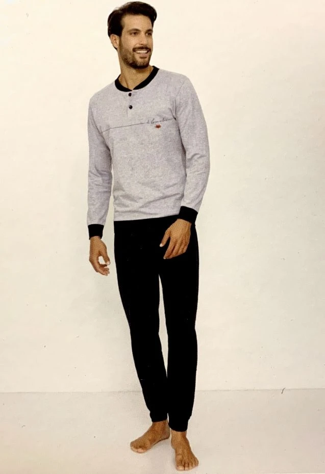 Offerta outlet Pigiama Uomo lungo 100% cotone leggero estivo jersey naturale ed anallergico con maglia manica lunga tinta unita con bordo in vita e polsini, aperta a serafino due bottone e pantalone lungo tinta unita con bordi alle caviglie.