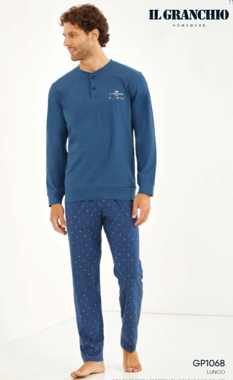Pigiama Uomo Lungo IL GRANCHIO 1068 in 100% cotone leggero jersey con maglia stampata aperta a serafino con bottoni, bordo ai polsi pantalone fantasia bordato alle caviglie