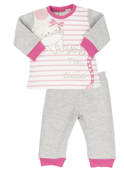 Bellissimo pigiama neonato cotone felpato invernale morbido naturale ed anallergico con maglia girocollo stampata con bottoni laterali a pressione bordato ai polsi ed in vita e pantalone tinta unita con bordo alle caviglie in contrasto . Massimo confort